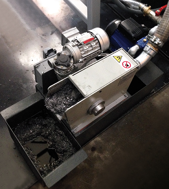 Funzionamento: i trucioli, che vengono introdotti attraverso la tramoggia di carico, cadono direttamente sulla parte inferiore del paniere e per effetto della forza centrifuga vengono spinti verso l’alto. Passando in corrispondenza del settore filtrante si liberano del lubrificante, risalgono poi verso il bordo superiore del paniere dove vengono espulsi e recuperati sul fondo della centrifuga.