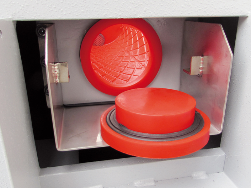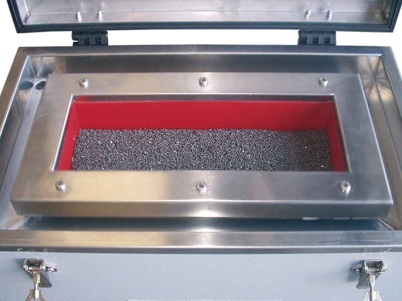 Vibratore rettangolare con telaio e coperchio insonorizzati e vasca rivestita in poliuretano antiabrasivo.